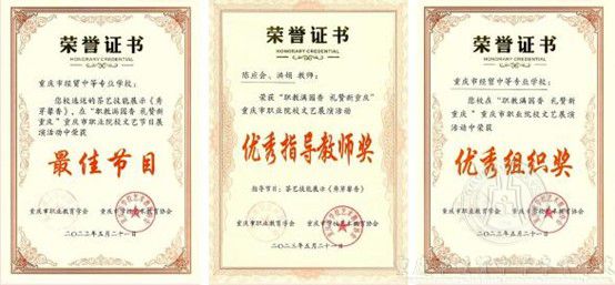 学校《秀芽馨香》节目荣获最佳节目奖,陈应会、洪娟2名老师荣获优秀指导教师奖,重庆市经贸中等专业学校获优秀组织奖。